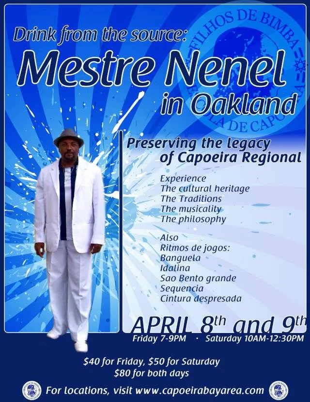 ZUMBIMBA celebrates the cultural legacy of capoeira and honors influential figures from the past and present. Join Filhos de Bimba - Bay Area Nov. 14-16 as we bring the axe of Salvador, Bahia to the Bay Area for a weekend of music, dance and capoeira! We are excited to have the presence of Mestre Nenel, Mestra Preguiça, Mestra Nalvinha and Mestre Canguru to help us celebrate and revel in the joy of capoeira and connect to its Afro-rooted origins!