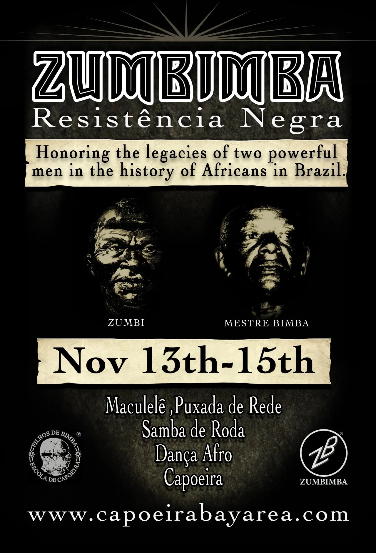 ZUMBIMBA is an annual celebration which was started in November 1991 by Filhos de Bimba – Escola de Capoeia to honor the legacies of two powerful men in the history of Africans in Brazil—Zumbi dos Palmares and Mestre Bimba. The contributions of these two men have elevated the consciousness of Afro-Brazilians and have brought together people of different cultures & backgrounds in unity.